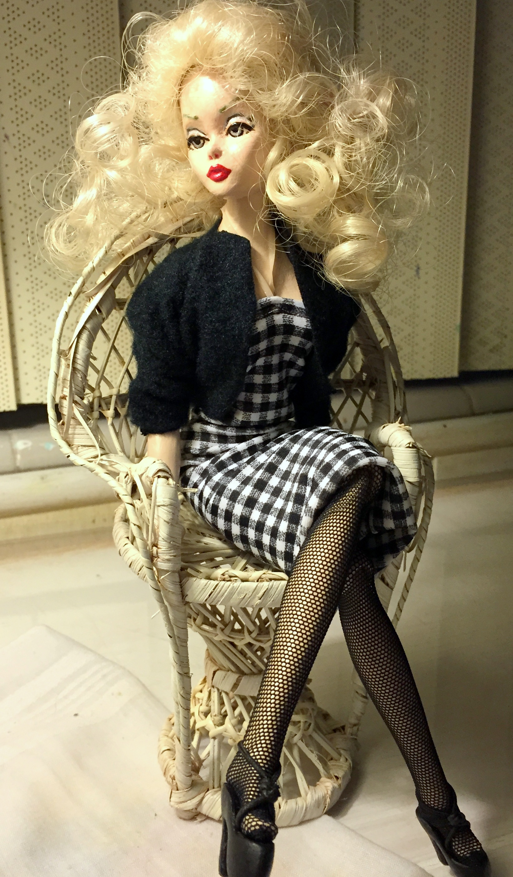 HER NAME IS LACE, THE UNIQUELY POSABLE, HANDMADE FASHION DOLL BY ANN SULLIVAN, WEARING HER ORIGINAL, INTRODUCTORY WIG, A  LACY, LACE COLLECTION LINGERIE ENSEMBLE & NYLONS & LACE COLLECTION LOVE-KNOT HEELS
