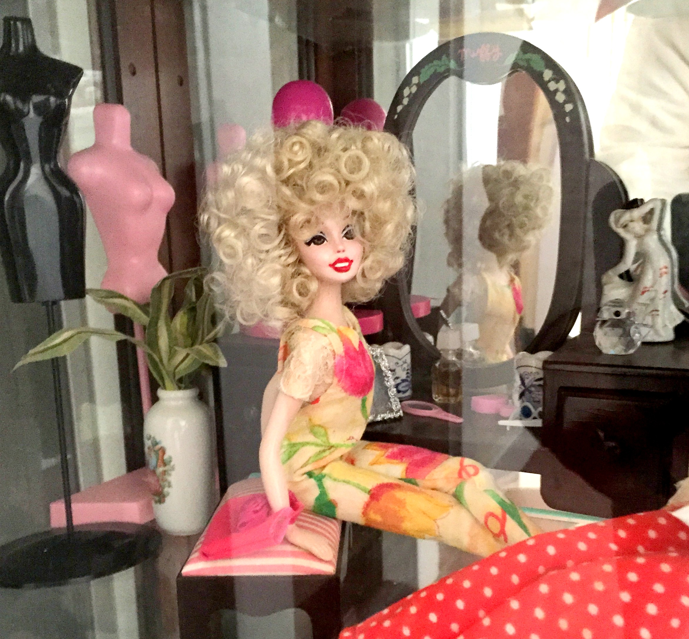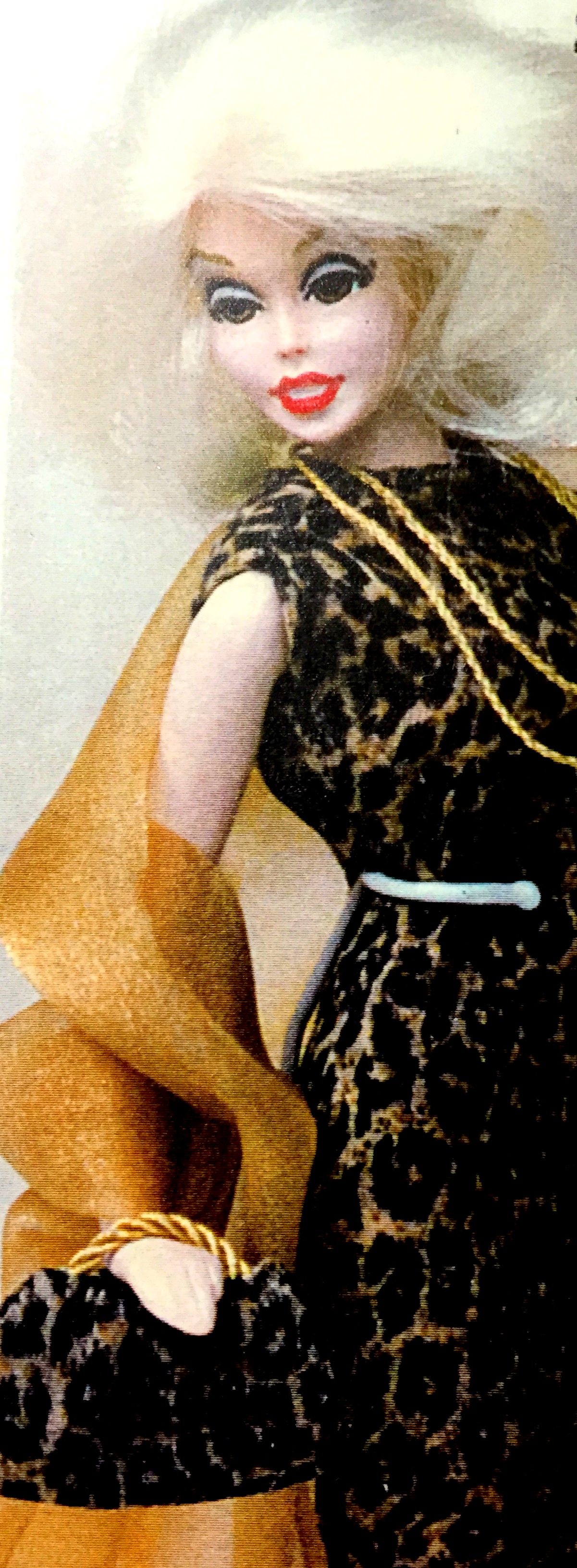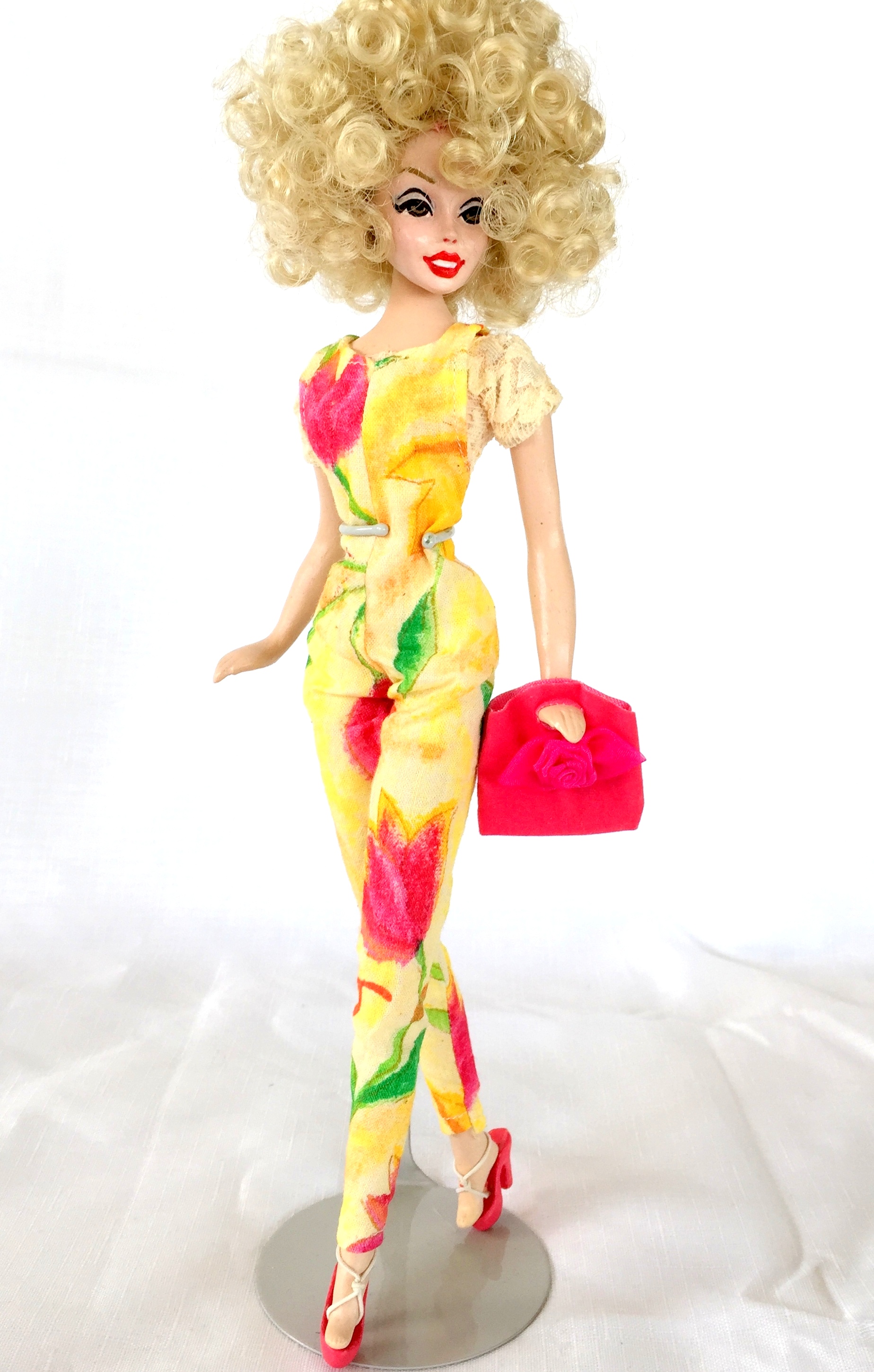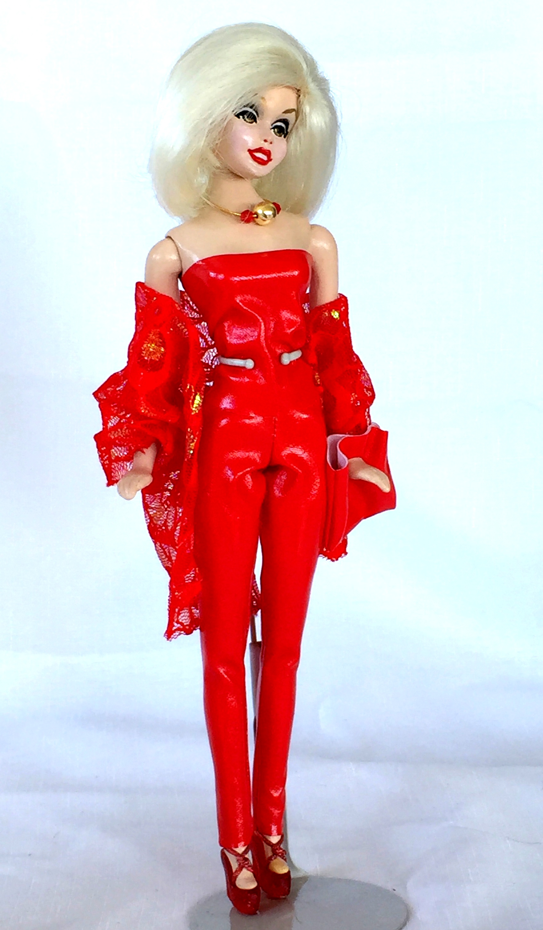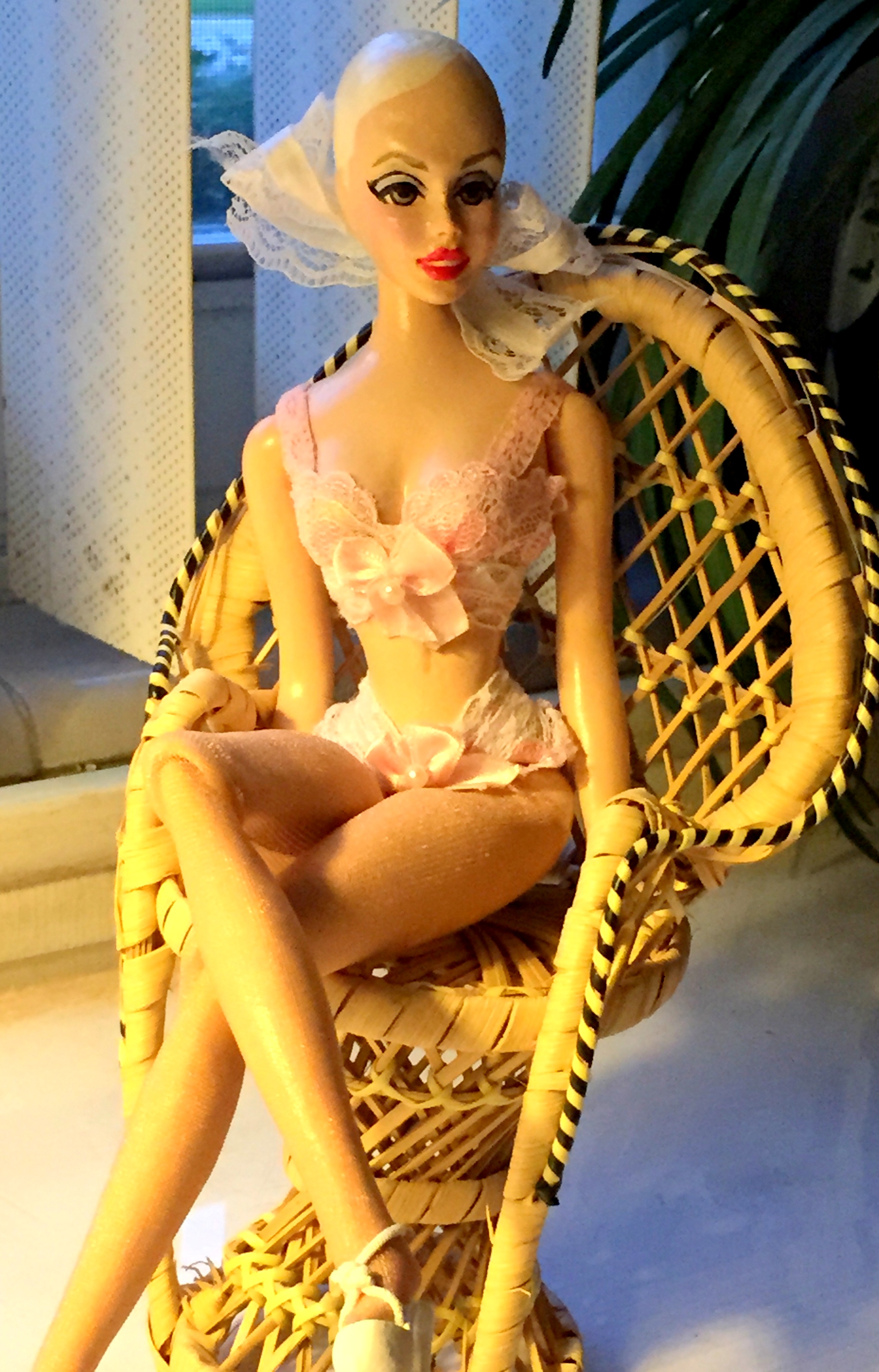 BLISS, LACE’S GOLDEN EYED BLOND COUSIN, WITH OPEN SMILING RED LIPS, WEARING, LACY, LACE COLLECTION LINGERIE & NYLONS & IN PHOTO A, HER INTRODUCTORY, ORIGINAL, BLOND WIG. IN PHOTO B SHE IS SANS WIG WITH RIBBON THREADED THROUGH A SMALL SPACE AT THE BACK OF HER HEAD. SHE IS THE FIRST CASTING OF BLISS &  A ONE OF A KIND, THE ONLY LACE DOLL DRILLED IN THAT WAY.