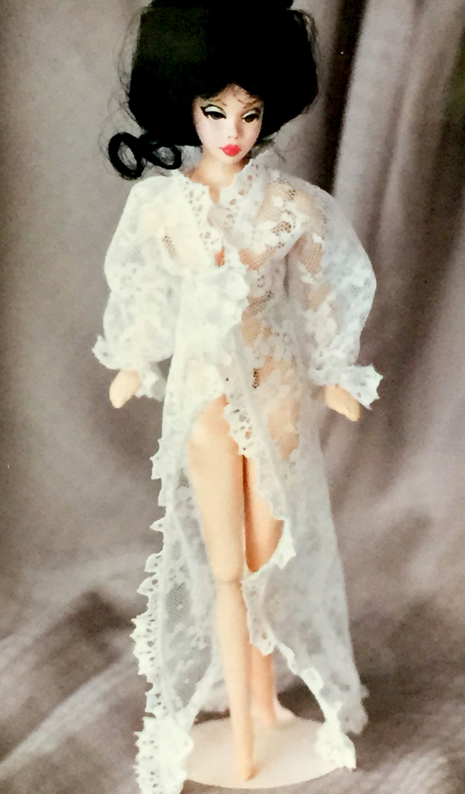 JILL, A BLUE EYED, RAVEN HAIRED BEAUTY, FROM LONDON, ENGLAND, WITH FULL PINK LIPS IN A SLIGHT SMILE, (SHADES OF ELIZABETH T), WEARING HER ORIGINAL WIG COLOR, BLACK, IN AN ALTERNATE STYLE & A LACE COLLECTION WHITE LACE NEGLIGEE, ” WEDDING RAPTURE”