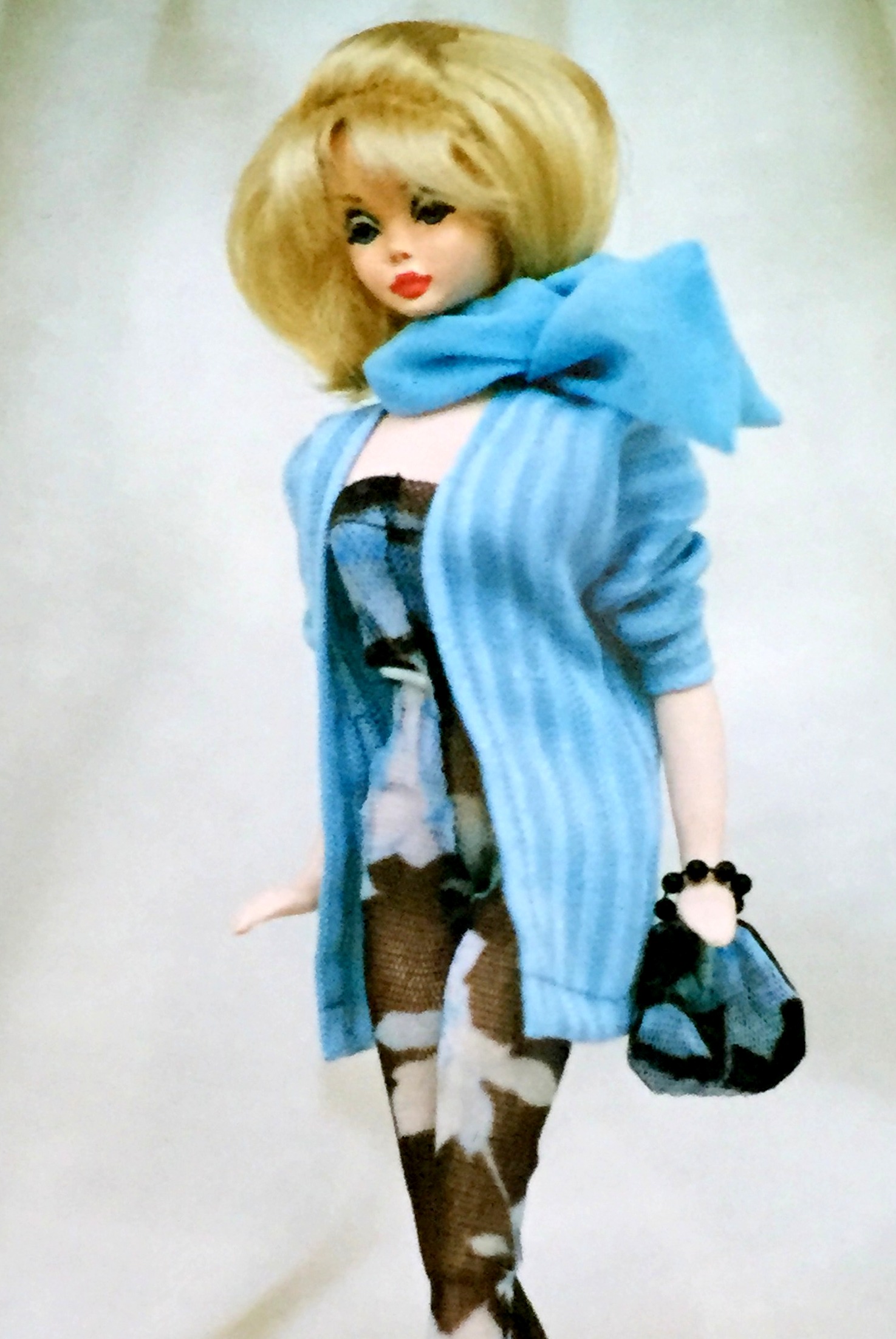 MICAELA, ANGELICA’S COUSIN,WITH BLOND HAIR, BLUE EYES & PINK LIPS IN A SLIGHT SMILE, WEARING HER ORIGINAL, INTRODUCTORY WIG, A LACE COLLECTION, VELVET, MINI SHEATH ENSEMBLE, GOLD NYLONS & LACE COLLECTION LOVE-KNOT HEELS