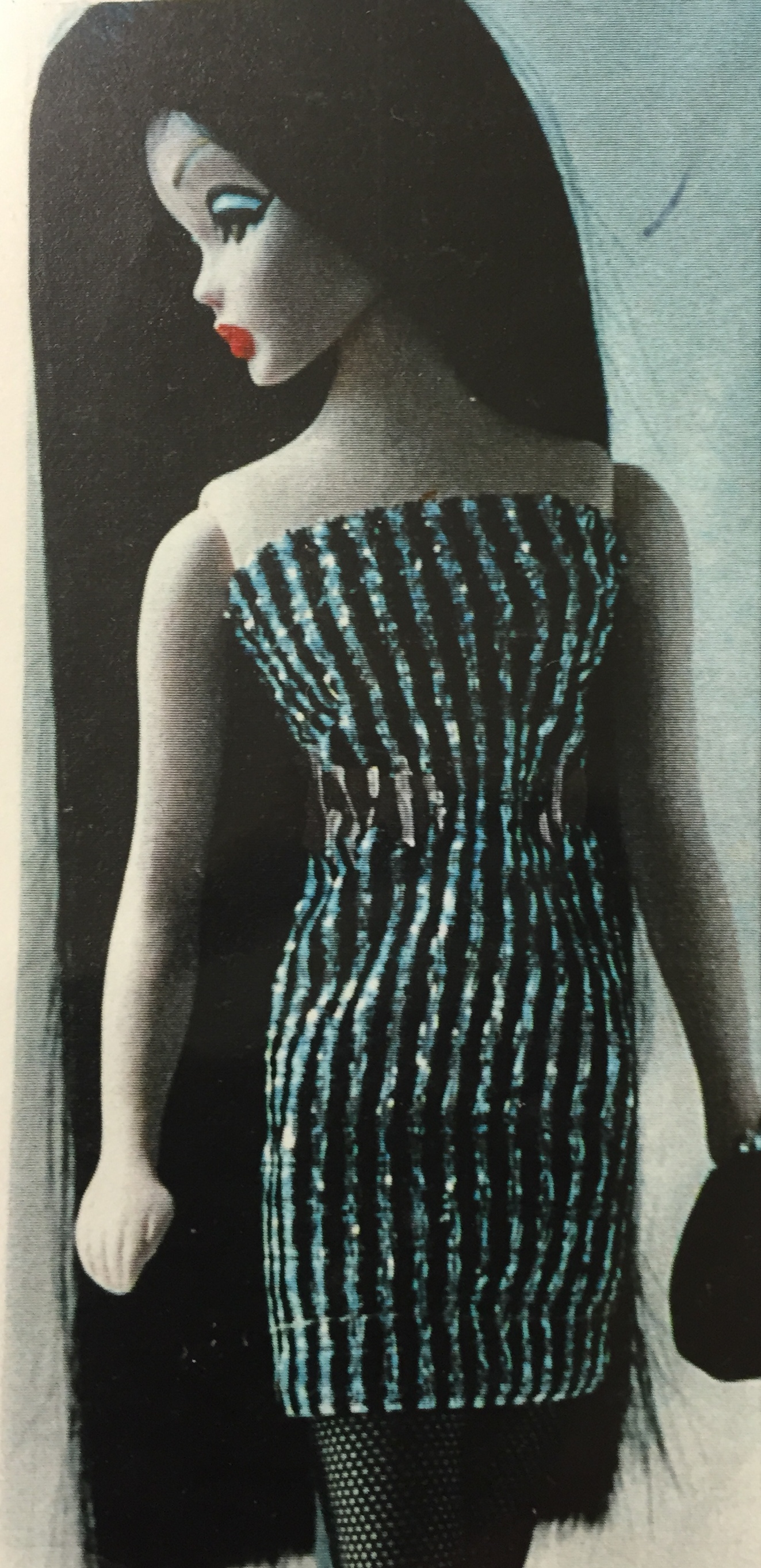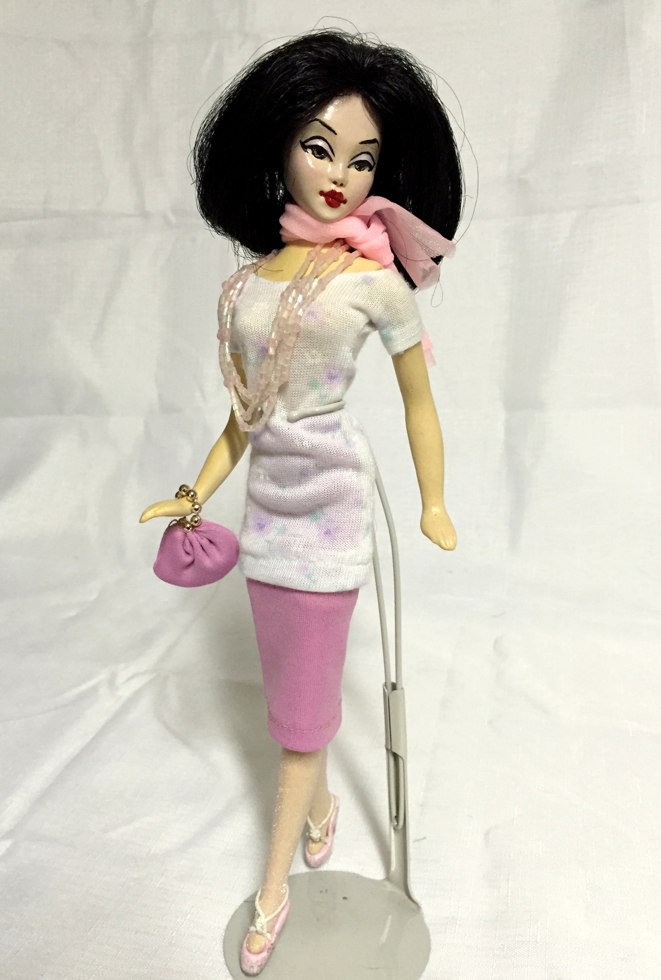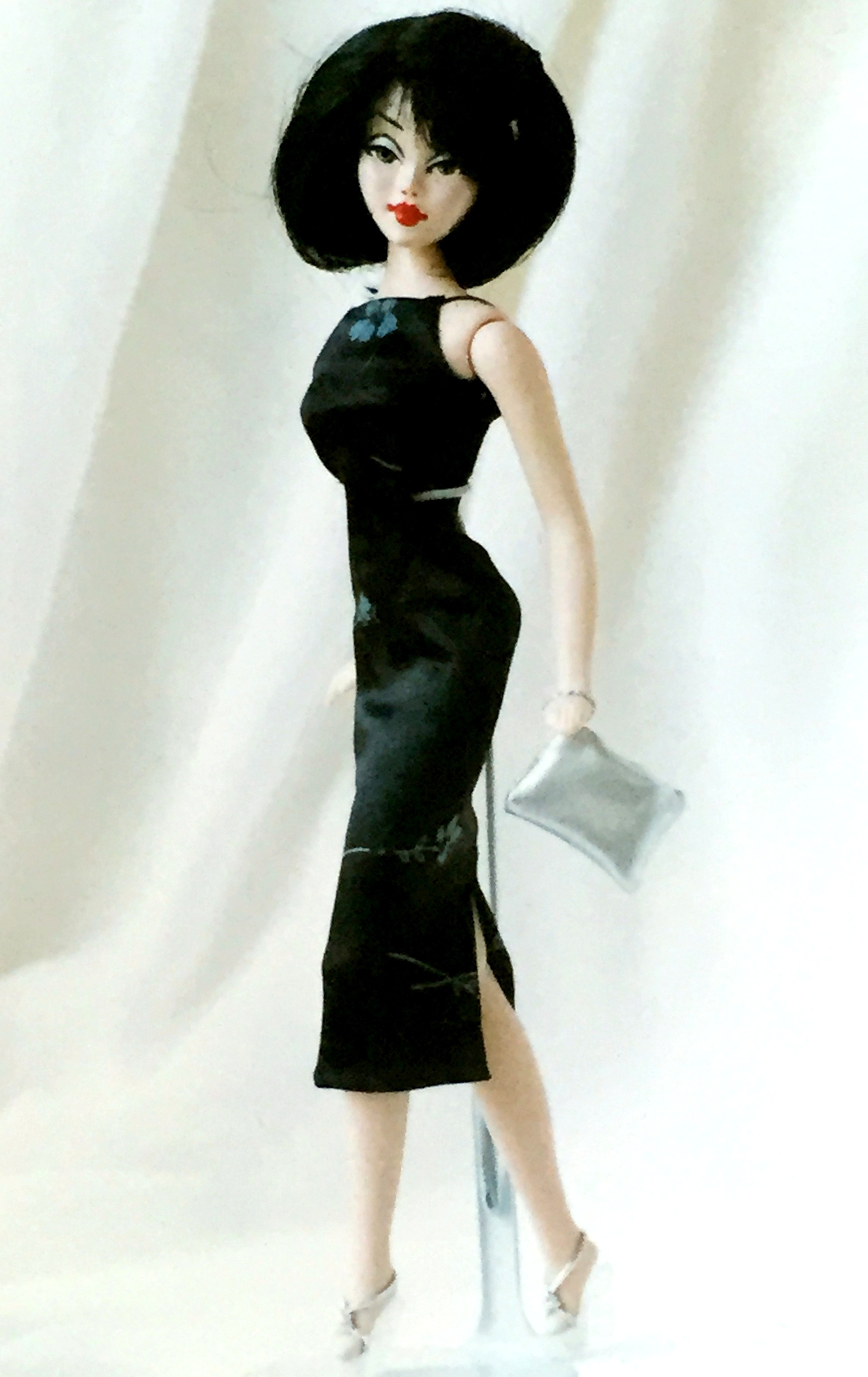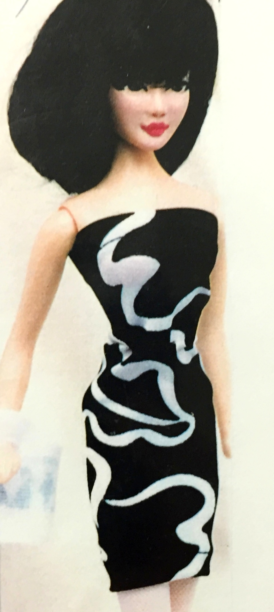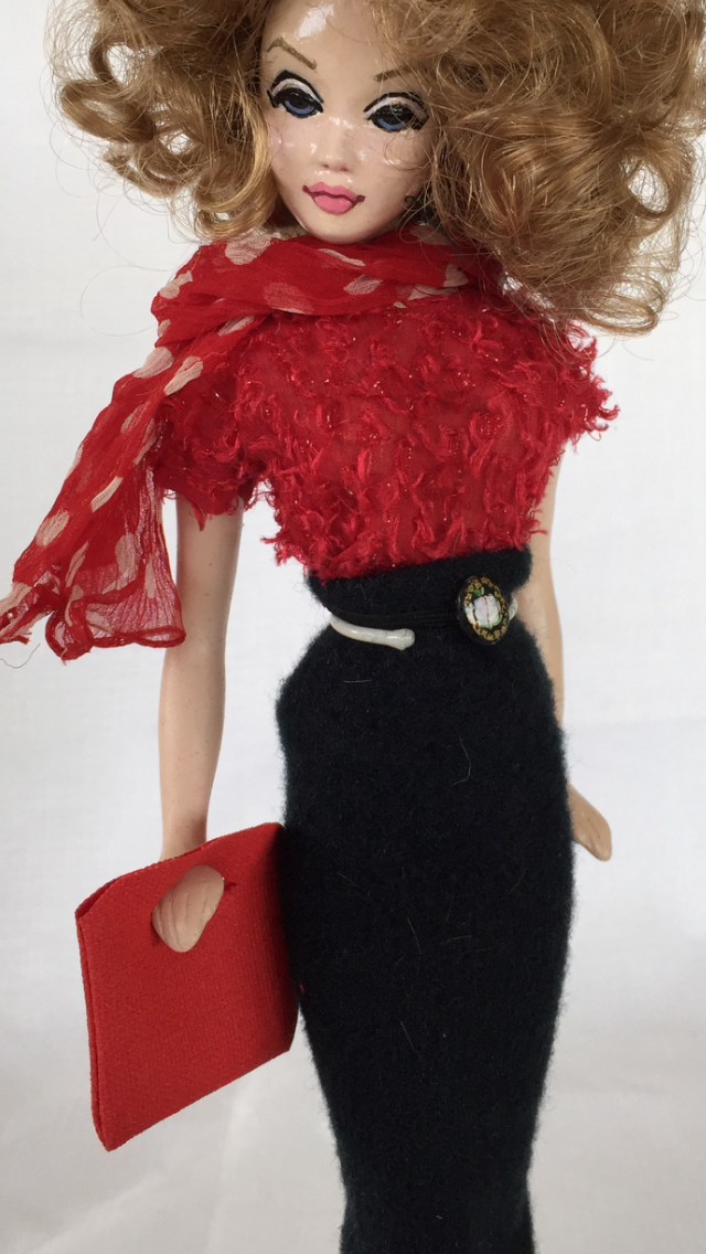PSYCHE, IN GREEK MEANING SOUL, LACE’S BEAUTIFUL GREEK COUSIN, WITH GOLD EYES, STRAIGHT BLACK HAIR & FULL, RED OR DARK PINK LIPS, WEARING HER ORIGINAL, INTRODUCTORY WIG, A LACE COLLECTION, MINI SHEATH ENSEMBLE & LACE COLLECTION LOVE-KNOT HEELS