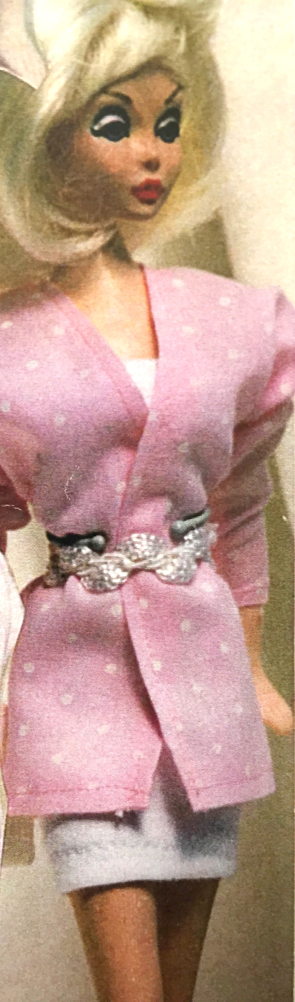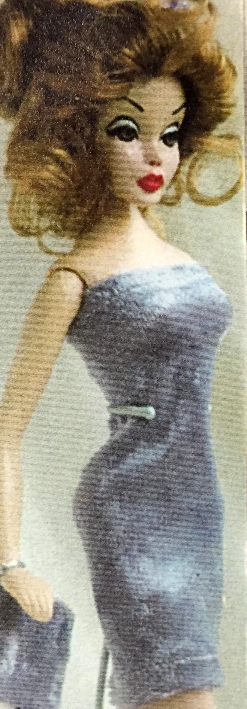 MICAELA, ANGELICA’S COUSIN,WITH BLOND HAIR, BLUE EYES & PINK LIPS IN A SLIGHT SMILE, WEARING HER ORIGINAL, INTRODUCTORY WIG, A LACE COLLECTION, VELVET, MINI SHEATH ENSEMBLE, GOLD NYLONS & LACE COLLECTION LOVE-KNOT HEELS