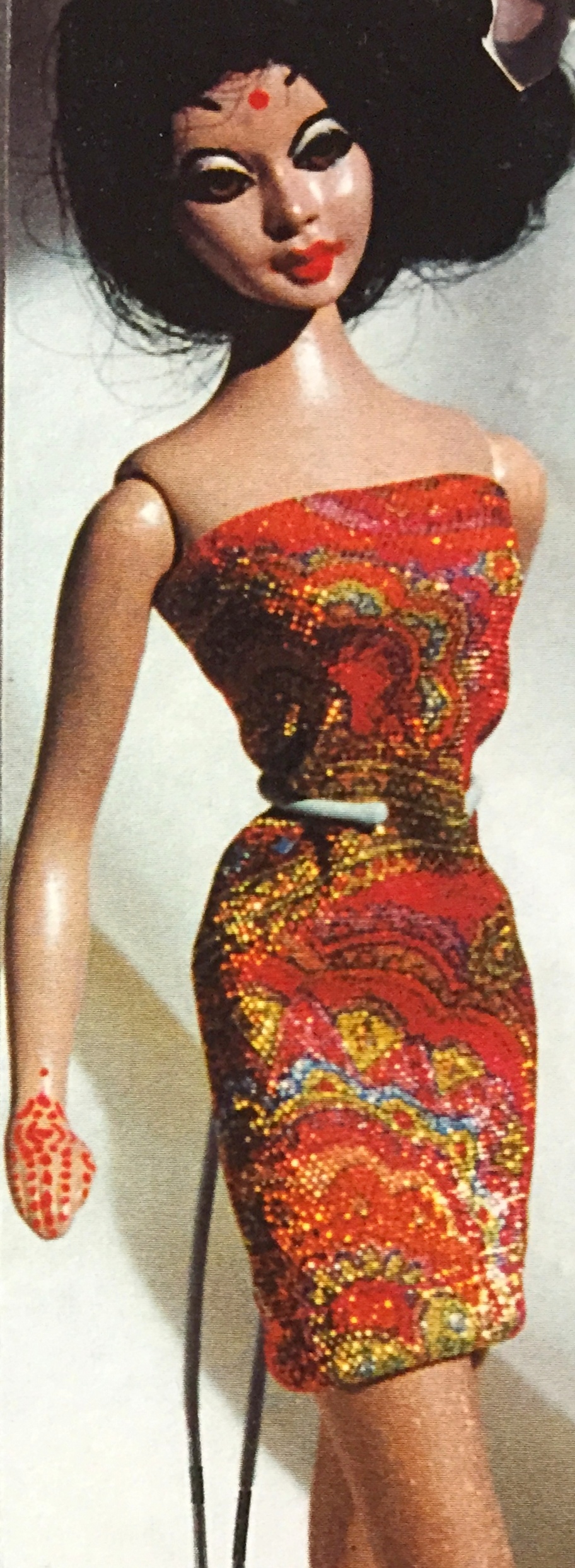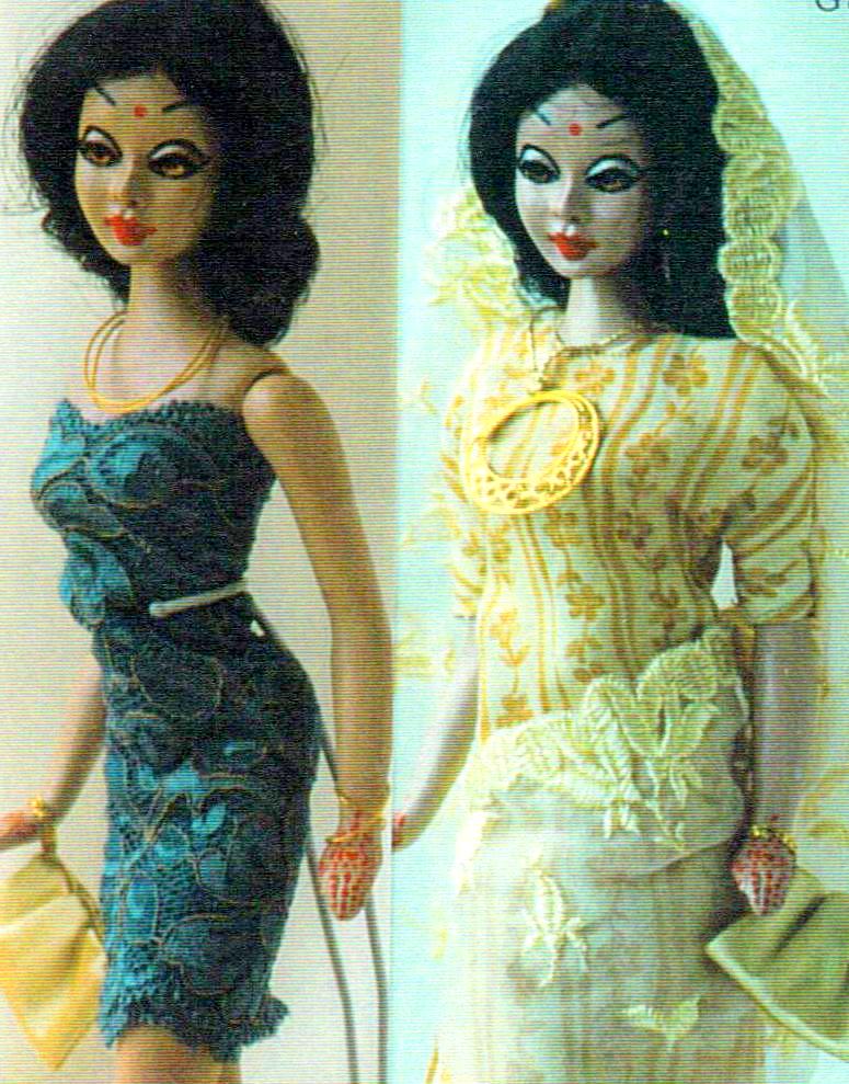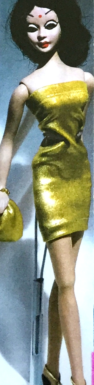 YASMINE, IN PHOTO A, WEARING HER ORIGINAL, INTRODUCTORY WIG & A LACE COLLECTION, INDIAN PRINT MINI SHEATH ENSEMBLE, IN PHOTO B, ON THE LEFT SHE WEARS A LACE COLLECTION, INDIAN DESIGN, STRETCH LACE, MINI SHEATH ENSEMBLE IN TEAL BLUE & ON THE RIGHT A GOLD PRINTED COTTON, TRADITIONAL INDIAN ENSEMBLE FOR HER PART IN MONSOON MOON.
